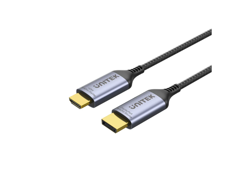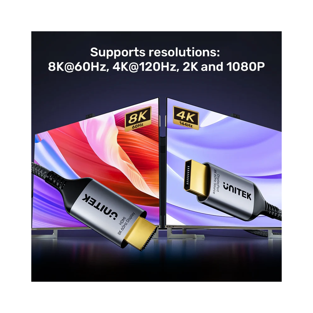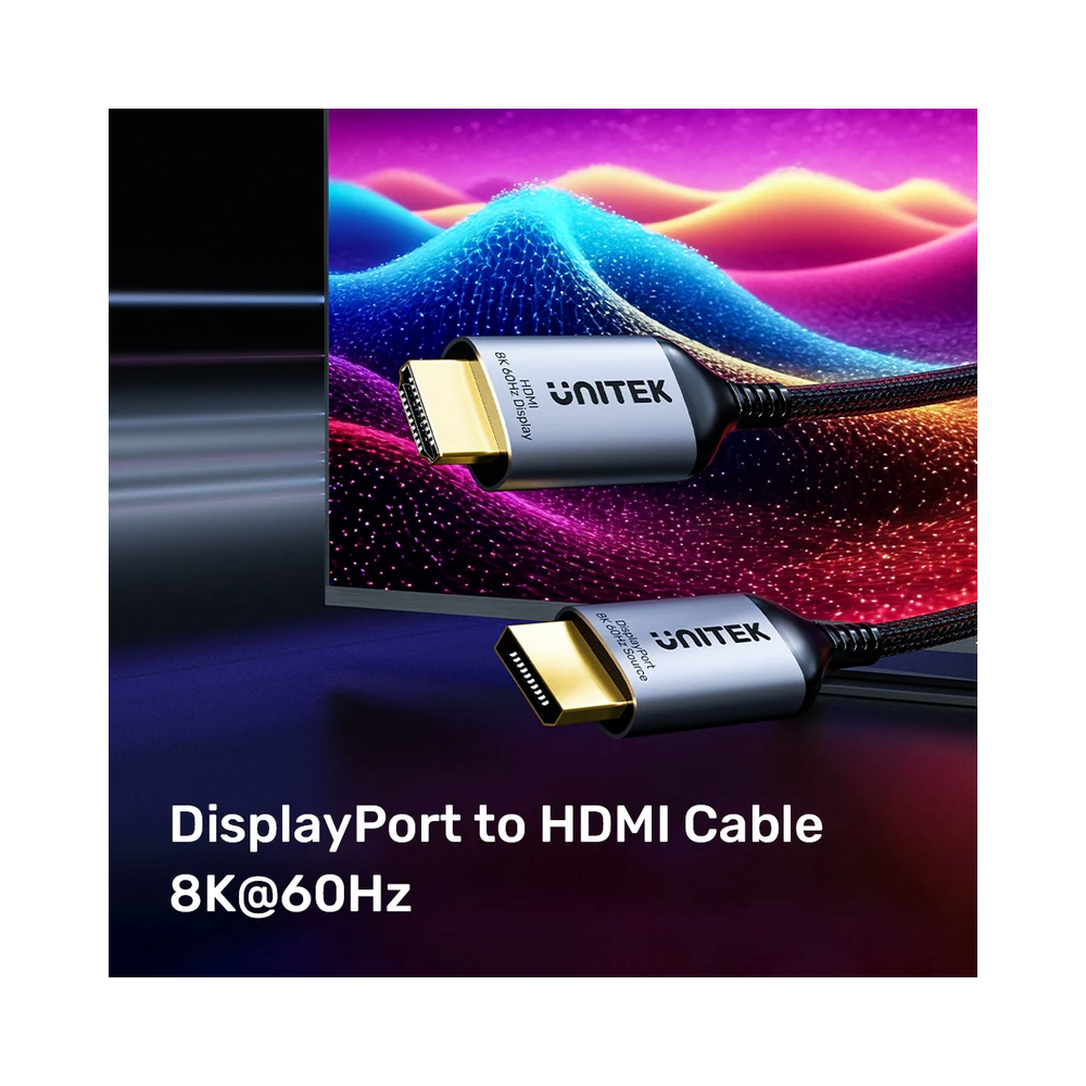 UNITEK DP 1.4 to HDMI 2.1 cable connects a computer, laptop, or other source device with DisplayPort to an HDTV/ monitor/ projector with HDMI output. Supports up to 8K@60Hz, HDCP 2.3 & Dolby Atmos.