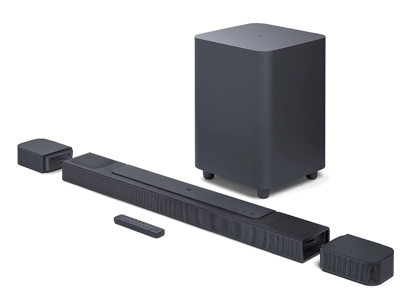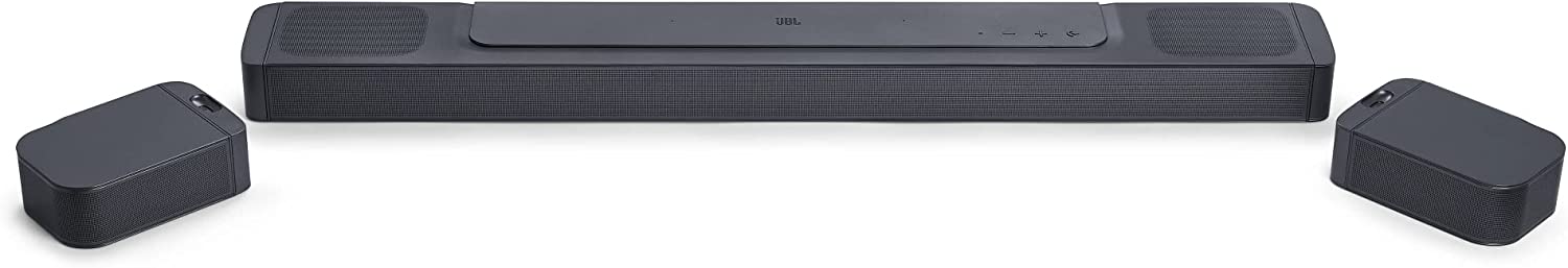 - [True Dolby Atmos Surround Sound] – Immerse yourself in theater-quality 3D sound. With two up-firing drivers, the JBL Bar 800 delivers true Dolby Atmos 3D surround sound. Real surround sound with detachable surround speakers Enjoy real surround sound without the hassle of extra wires and power connections. Just place the two detachable battery-powered surround speakers behind you and get swept away in amazing audio.