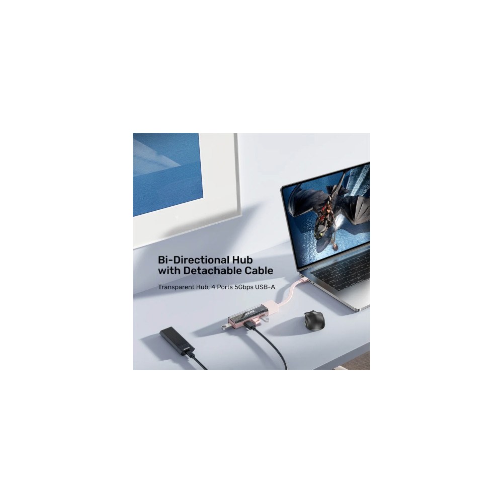 This hub supports upstream connections via both USB-A and USB-C using a single detachable cable, making it extremely convenient for use with any computer. Its transparent design and four ports offer fast data transfer speeds of up to 56Gbps, ensuring efficient performance for all your devices. Enjoy the flexibility and ease of connection with this versatile hub.