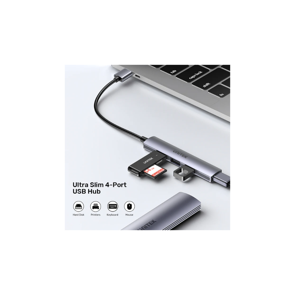 Elevate your connectivity with the UNITEK Ultra Slim 4-Port USB Hub. Designed for convenience, it allows you to connect multiple devices such as hard disks, printers, keyboards, and mice from a single hub, keeping your workspace organized and clutter-free. This sleek accessory is perfect for anyone looking to expand their device connections without sacrificing style or performance.