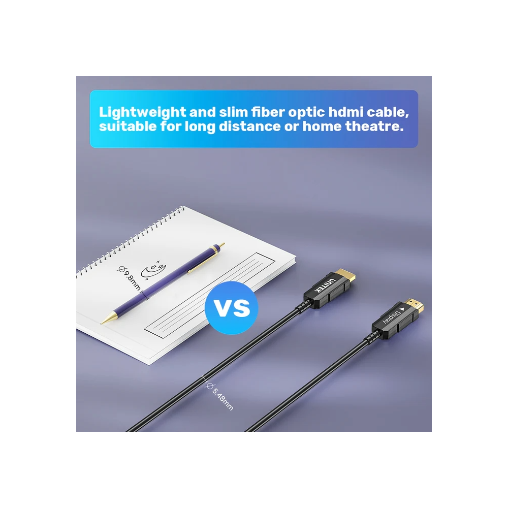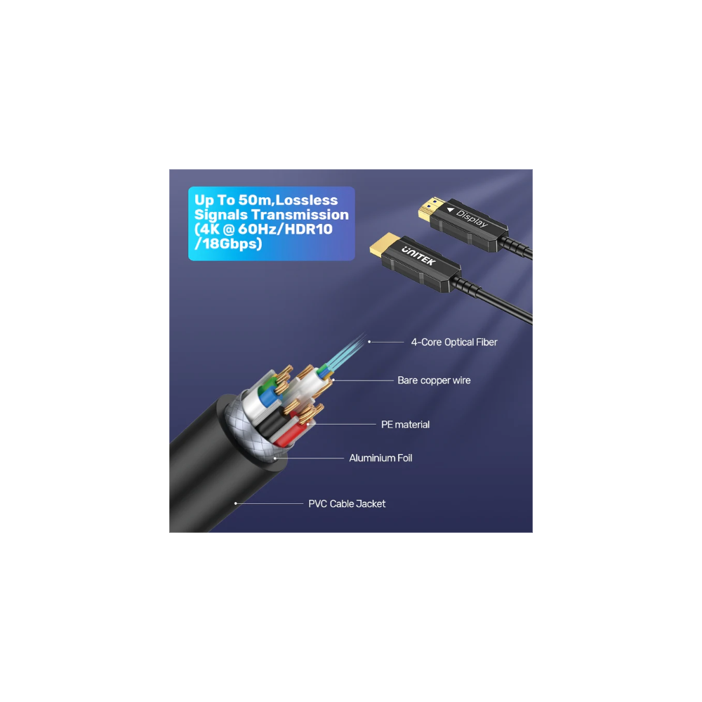 Achieve unparalleled audio and video quality with the UNITEK 4K 60Hz HDMI Fiber Optic Cable. Designed for lossless signal transmission up to 50 meters, this cable supports stunning 4K resolution at 60Hz, HDR10, and speeds of 18Gbps. The construction features 4-core optical fiber for exceptional clarity, along with superconducting copper that enhances conductivity for reliable performance. Made with PE material, aluminum foil shielding, and a robust PVC cable jacket, it effectively prevents interference and protects against wear. Additionally, the 24K gold-plated plugs provide superior conductivity and resistance to oxidation, all housed in an elegant metal casing for better heat dissipation. Upgrade your setup with a cable that guarantees high-quality, uncompressed audio and video synchronization, perfect for all your 4K devices!