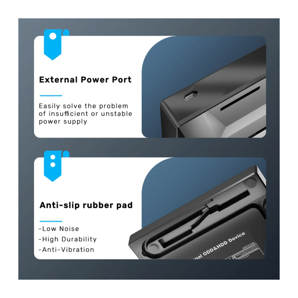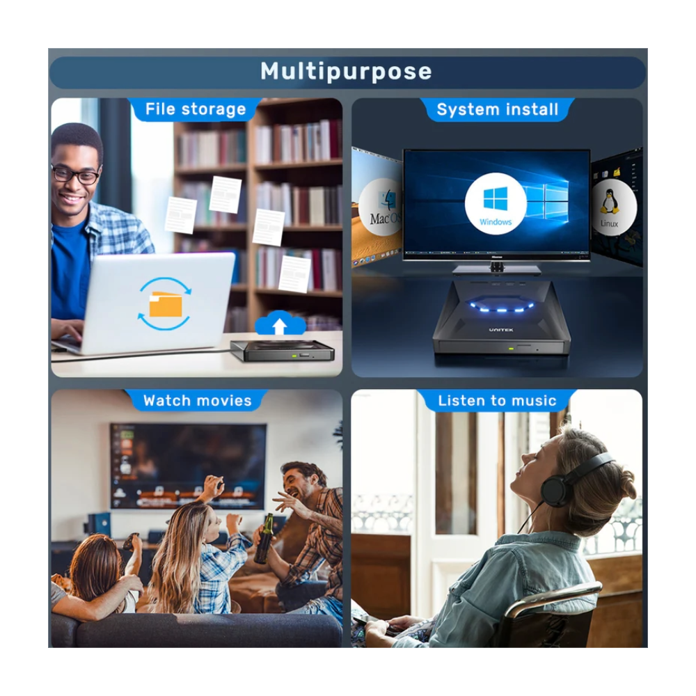 - 5-in-1 Optical Drive: Aside from being a CD/ DVD reader/ burner, UNITEK external optical drive also equipped with 2 USB-A ports, SD card reader.