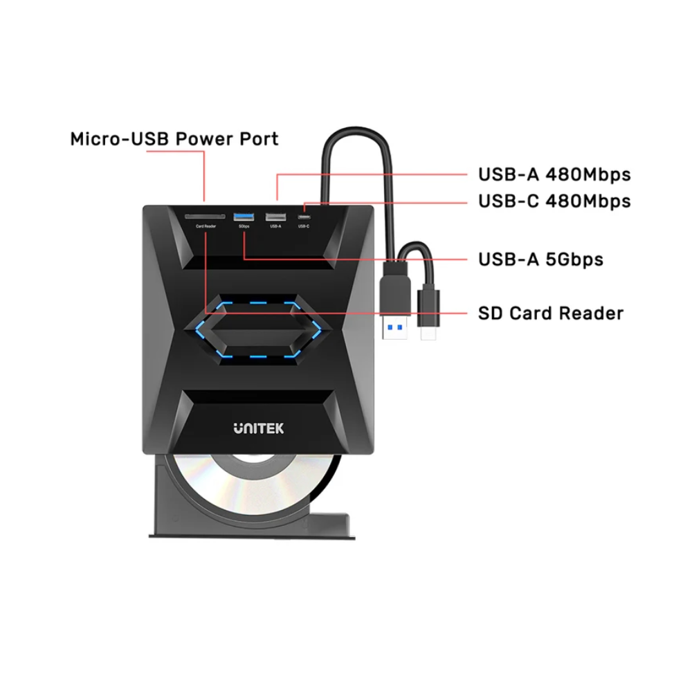 The UNITEK external optical drive does not only read CD and DVD, but also can be used as USB hub, including 2 USB-A Ports, 1 USB C port, and SD card slot. Upstream 5Gbps, 5Gbps USB-A, 8x DVDR Write/Read Speed.