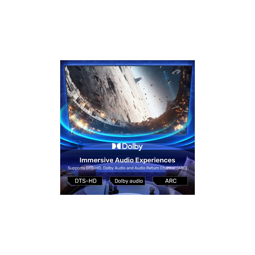 Supports DTS-HD and Dolby audio for immersive surround sound with compatible sound systems. The Audio Return Channel (ARC) allows your TV to send audio to an external audio system, creating a cinematic home theatre experience—watch your favorite films at home as if you’re in a cinema.