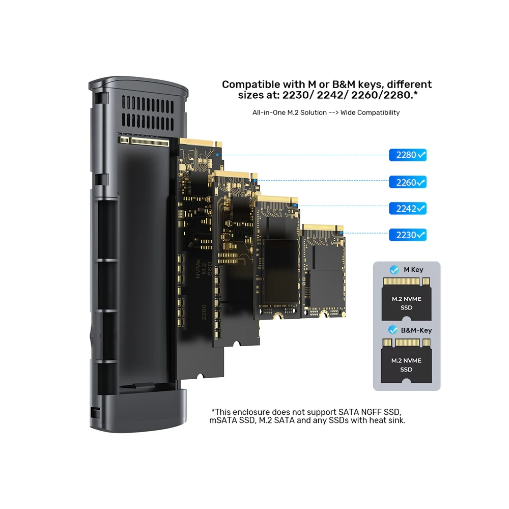 - Wide Compatibility: This PCIe NVMe M.2 SSD enclosure only supports M.2 NVMe M-Key SSD with the size 2230/2242/2260/2280 solid state drivers.*