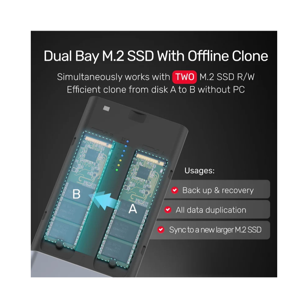 • Dual bay can function simultaneously and support offline data cloning without PC.