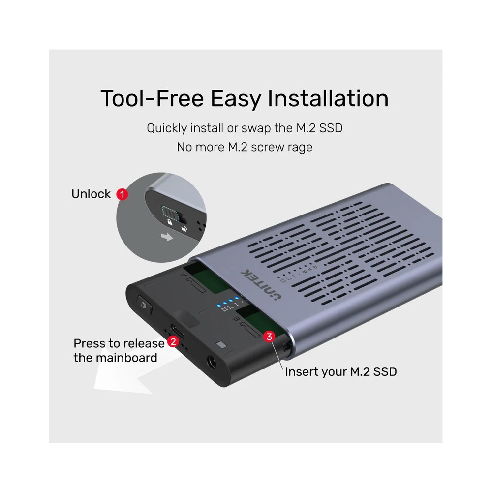 Unitek SolidForce USB-C to PCIe/NVMe M.2 SSD 20Gbps Dual Bay Enclosure with Offline Clone
