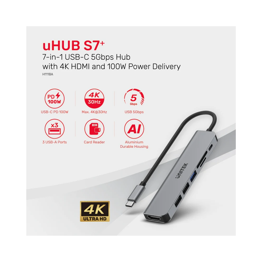 Unitek uHUB S7+ 7-in-1 USB-C 5Gbps Hub with 4K HDMI and 100W Power Delivery
