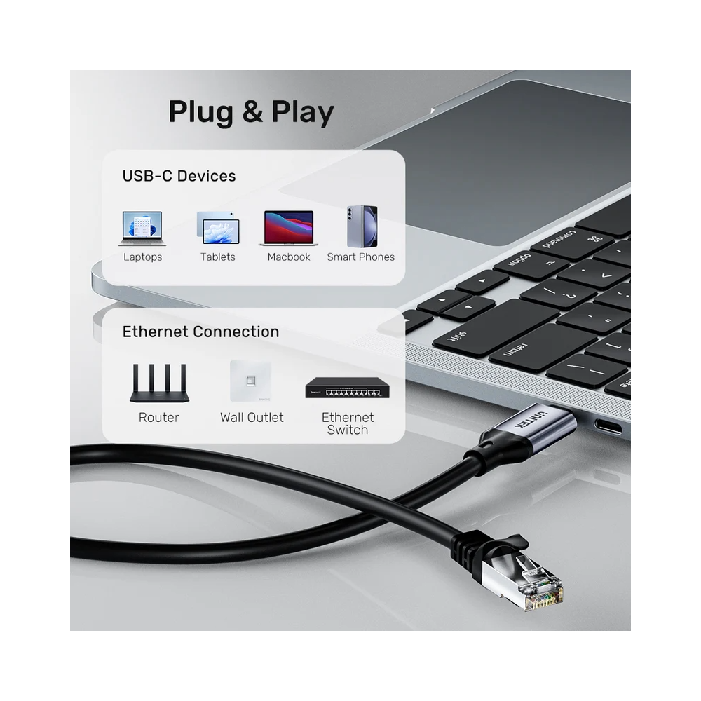 UNITEK USB-C to RJ45 Ethernet cable is extremely convenient to use. It eliminates the need for drivers or adapters and connects your computer or device directly to a router, modem, or network switch. Plug & play, this cable is a perfect substitute if your computer’s RJ45 port is damaged. Gigabit LAN Network, Supports Thunderbolt 3/ 4.