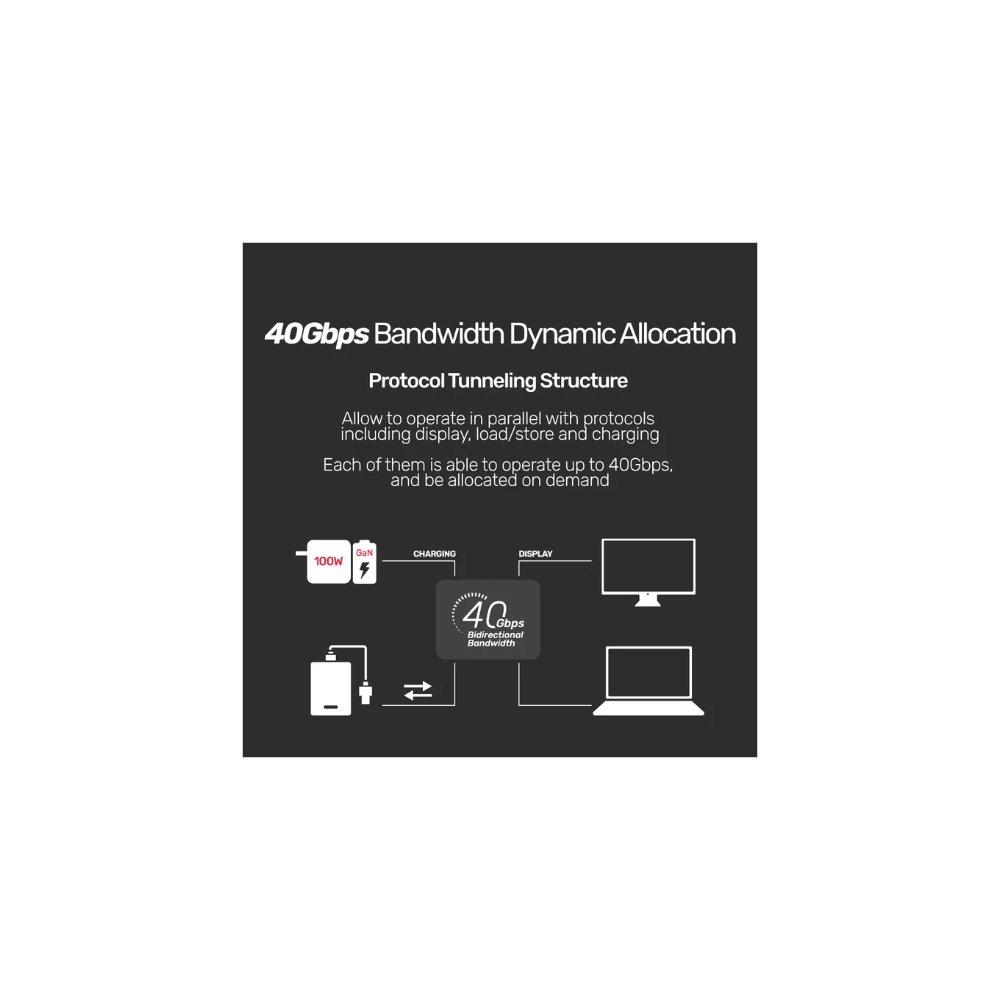 Allowing multiple protocols—such as display, load/store, and charging—to operate in parallel. Each protocol can function at speeds up to 40Gbps, allocating bandwidth on demand for optimal performance.